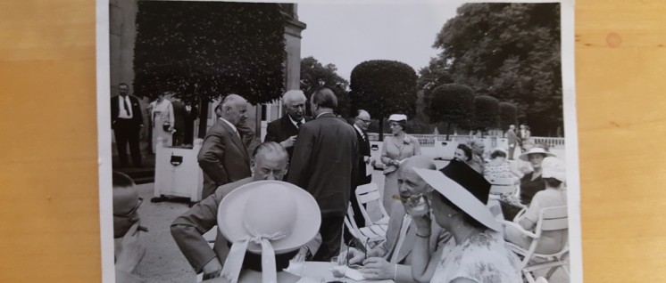 hier Theodor Heuss (im dunklen Anzug, im Gespräch mit zwei Herren), die