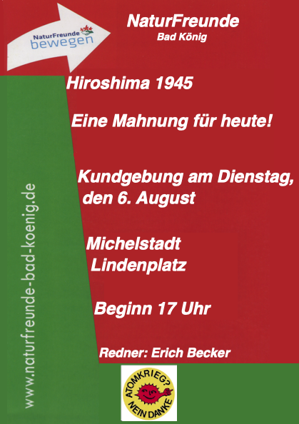 | 06.08.2024, 17:00 Uhr, Lindenplatz, Michelstadt | Hiroshima Kundgebung (Naturfreunde) |