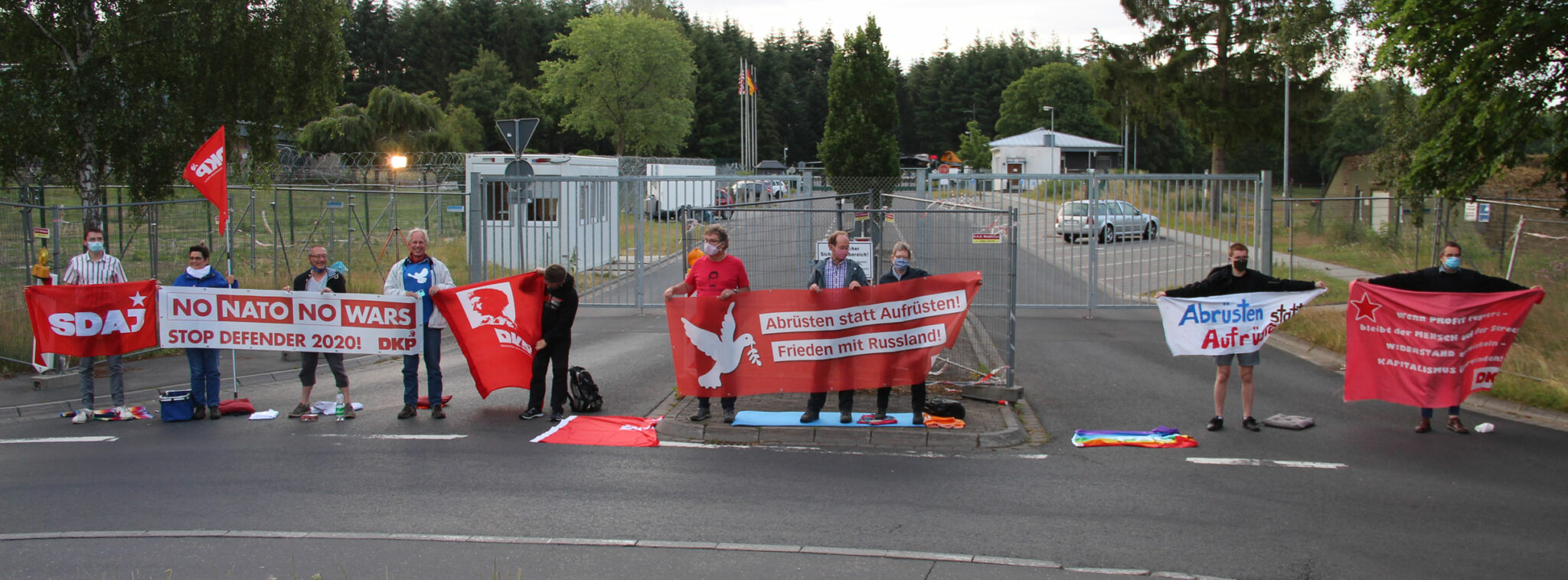 Am Freitagmorgen (10. Juli 20) um 6 Uhr haben Mitglieder der Sozialistischen Deutschen Arbeiterjugend (SDAJ) und der Deutschen Kommunistischen Partei (DKP) den Atomwaffenstützpunkt Büchel in Rheinland-Pfalz blockiert und alle drei Tore dicht gemacht.