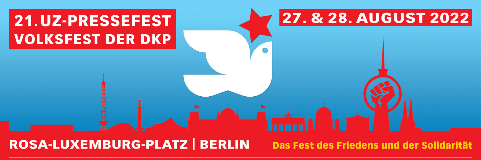 Auf nach Berlin Am 27. + 28.08.2022 findet unser UZ-Pressefest statt. Diesmal in Berlin, über die Hintergründe seid ihr sicher aus der UZ informiert. Weitere Infos findet ihr unter pressefest.unsere-zeit.de/