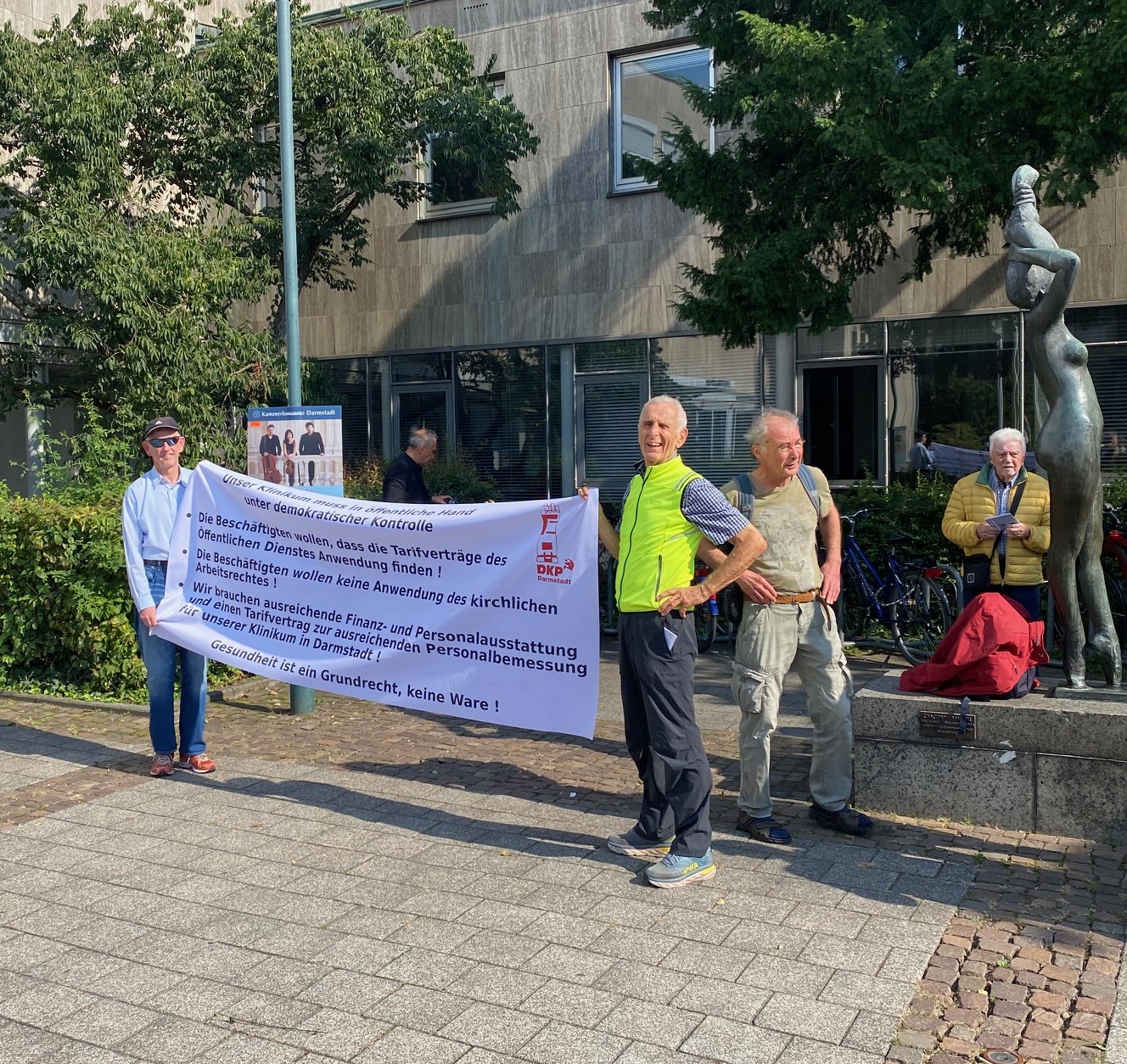 Bild: Mitglieder der DKP bei einer Protestaktion der Gewerkschaft ver.di gegen die geplante Fusion des Klinikum Darmstadt und des kirchlichen Agaplesion-Elisabethenstiftes am Rande der Darmstädter Stadtverordnetenversammlung am 19. September 2024
