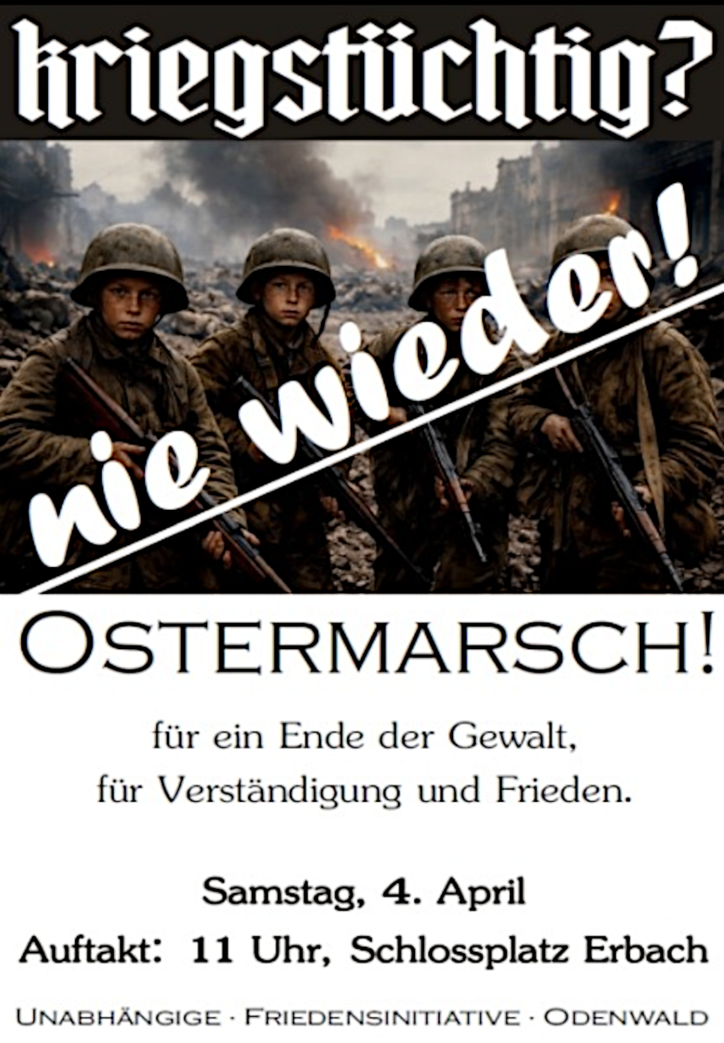 Wir rufen zur Teilnahme an den hessischen Ostermärschen auf. In unserer Region findet am Ostersamstag, den 26. März 2026 der Odenwälder Ostermarsch statt. Die Demonstration beginnt um 11:00 Uhr in Erbach auf dem Schlossplatz und endet gegen 14:30 Uhr in Michelstadt auf dem Lindenplatz. Im Anhang findet ihr die aktuelle Pressemitteilung der Unabhängigen Friedensinitiative Odenwald (UFO).